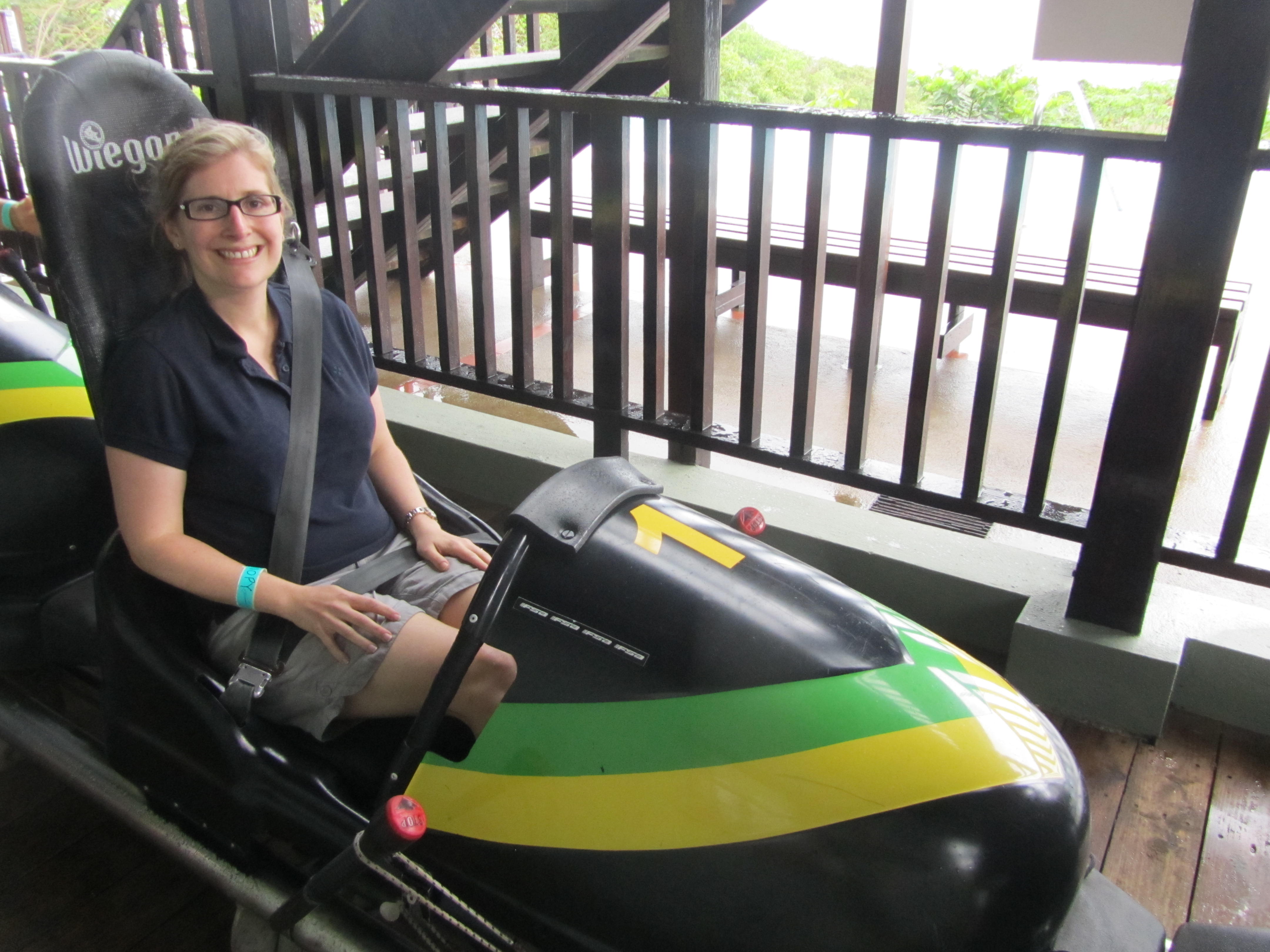 Bianca decided to brave the rain, lightning and all fashion sense, to go bob-sleding and zip-lining at Mystic Mountain.