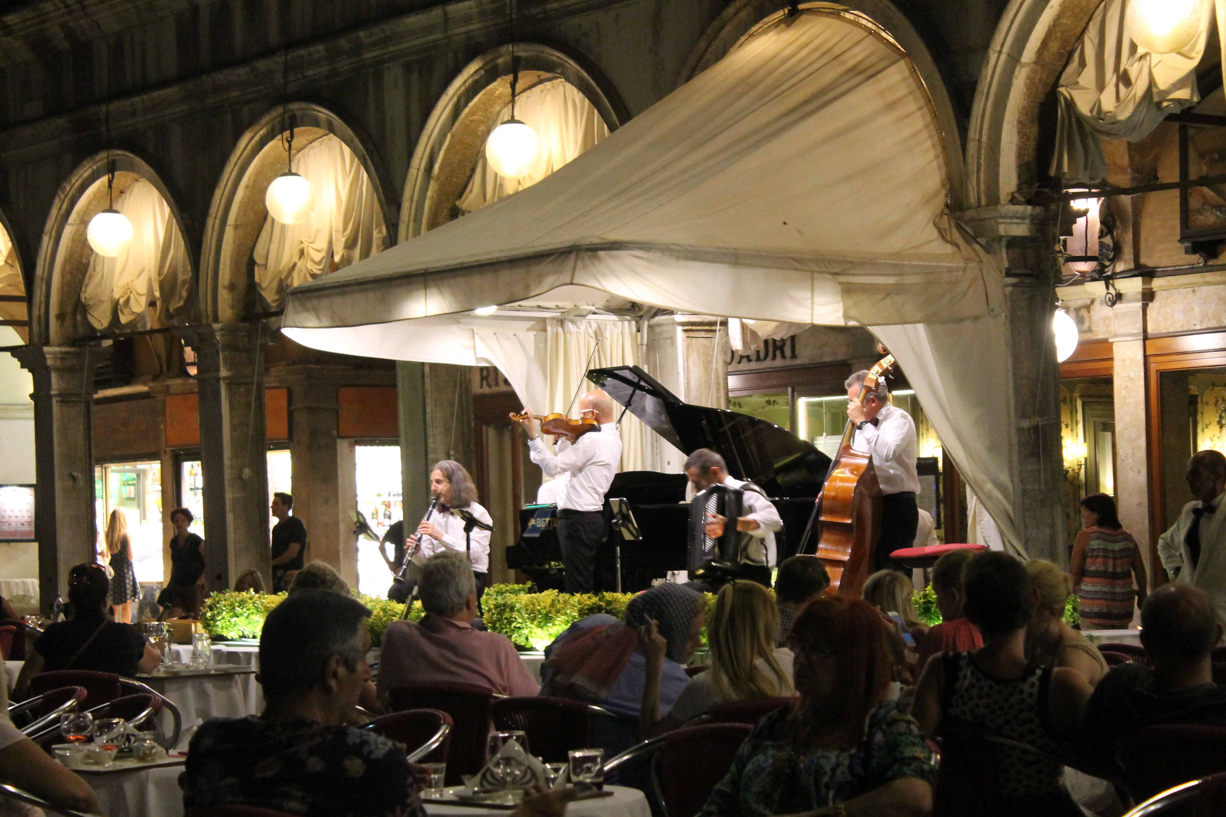 A late night wander through Piazaa San Marco enjoying the gorgeous buildings, lights and live music coming from the outdoor cafes. Five of the outdoor cafes had live 5-musician orchestras playing – it was magical and a lovely way to finish a fantastic day!